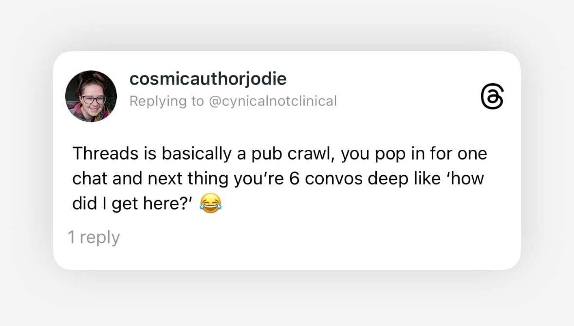 Then there’s Threads, the one corner of the internet where it finally feels like you can just talk again without filters and SEO strategy and a pretty content calendar. You brain-dump whatever’s on your mind and people respond.